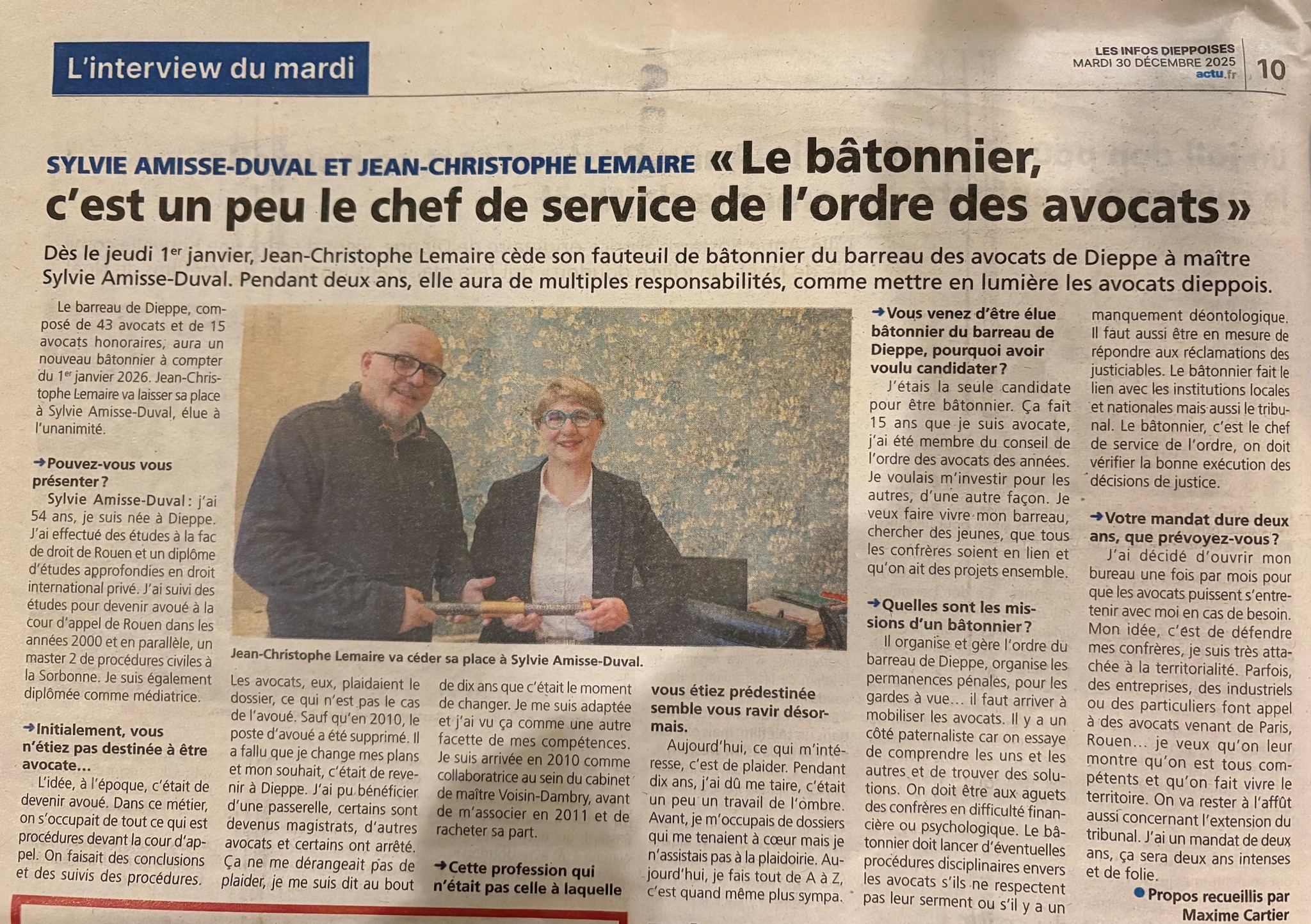 L'Ordre des avocats du Barreau de Dieppe remercie Les Informations Dieppoises et adresse à Maître Sylvie Amisse-Duval tous ses vœux de réussite dans l’exercice de ses nouvelles fonctions.